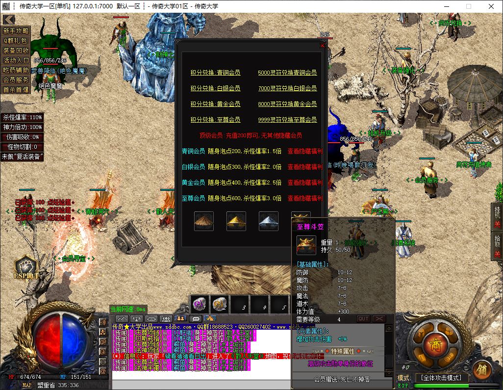 人物升级:随身泡点+击杀怪物获得经验,可以商铺购买聚灵珠,会员有泡点加成